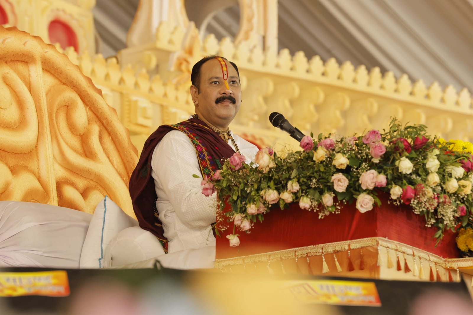 भीलवाड़ा लोकजीवन। श्री महाशिवपुराण कथा का श्रवण कराने मेवाड़ की पावन धरा भीलवाड़ा की भूमि पर पहली बार पधारे प्रख्यात कथावाचक ‘कुबेर भण्डारी’ पंडित प्रदीप मिश्रा के मुखारबिंद से कथा सुनने के लिए विशाल जनसमूह इस कदर उमड़ रहा है कि सात दिवसीय कथा के दूसरे दिन गुरूवार को मेडिसिटी ग्राउण्ड के साढ़े चार लाख वर्ग फीट में फैले डोम ओर पाइप पांडाल में पैर रखने की जगह नहीं बची तो आस्था व भक्ति से ओतप्रोत श्रद्धालु बाहरी क्षेत्र में जहां जगह मिली वहीं बैठ कथा सुनने लगे। कथा विश्राम के बाद वहां की पावन रज सिर पर लगाने के बाद ही श्रद्धालु पांडाल से बाहर निकले। कथा के दूसरे दिन भी पंडित प्रदीप मिश्रा संकटमोचन हनुमान मंदिर के महन्त बाबूगिरी महाराज के साथ कथास्थल मेडिसिटी ग्राउण्ड के मंच पर पहुंचे तो विशाल पांडाल ‘श्री शिवाय नमस्तुभ्यं’ ओर हर हर महादेव के जयकारों से गूंजायमान हो उठा। कथा में पंडित प्रदीप मिश्रा ने शिव महापुराण के प्रसंग की चर्चा करते हुए कहा कि हर शहर ओर परिवार में एक ‘मंथरा’ घूमती रहती है जो तुम्हारे पास भी आएगी। वह यह देखती है कि किसके माता पिता के संस्कार कैसे है क्योंकि वहीं संस्कार संतान के अंदर आते है। मंथरा भड़काने का कार्य करती है कानो में धीमा जहर देती है। मंथरा की बातों को ध्यान देकर सुन लिया तो घर टूट कर रहता है। उन्होंने कहा कि लोहे को लोहा ही काटता है उसी तरह दूसरों की सुनने से बिगड़ा है तो शिव महापुराण कथा सुनने से सुधरना शुरू हो जाएगा। जीवन के 16 संस्कारों में चेहरे पर प्रसन्नता रहनी चाहिए। अंतिम संस्कार के समय भी चेहरे पर प्रसन्नता रहे कि संसार छोड़ परमात्मा से मिलने जा रहा हूं। जिंदगी में कितना भी दुःख या सुख आ जाए समभाव में रहे। महाराजश्री ने कहा कि व्यक्ति पत्नी के साथ सात फेरे लेते ही पशुपतिनाथ बन जाता है। जीवन में तीर्थयात्रा जरूर करे वहां भक्ति व शक्ति मिलती है। दुनिया में भगवान शंकर के 12 ज्योर्तिलिग के दर्शन तकदीर बदल देते है। इनके दर्शन करने पर मनुष्य का समय ओर तकदीर बदलने का सामर्थ्य मिलता है। इन 12 ज्योर्तिलिंग पर नहीं जा सकते तो घर के समीप शिवलिंग पर जल चढ़ाने पर भी भगवान शिव स्वीकार करते है। कथा के दूसरे दिन कथा के प्रारंभ में व्यास पीठ पर विराजित पंडित मिश्रा का अभिनंदन करने वालों में महन्त बाबूगिरी महाराज के साथ हाथीभाटा आश्रम के महंत संतदास महाराज, संत लालदास महाराज आदि शामिल थे। कथा के दौरान पहुंचे जयपुर हवामहल के विधायक बालमुंकदाचार्य ने व्यास पीठ पर विराजित पंडित प्रदीप मिश्रा का अभिनंदन कर आशीर्वाद लिया। दूसरे दिन की कथा विश्राम पर व्यास पीठ की आरती करने वालों में विधायक बालमुंकदाचार्य, राष्ट्रीय स्वंयसेवक संघ के अखिल भारतीय क
